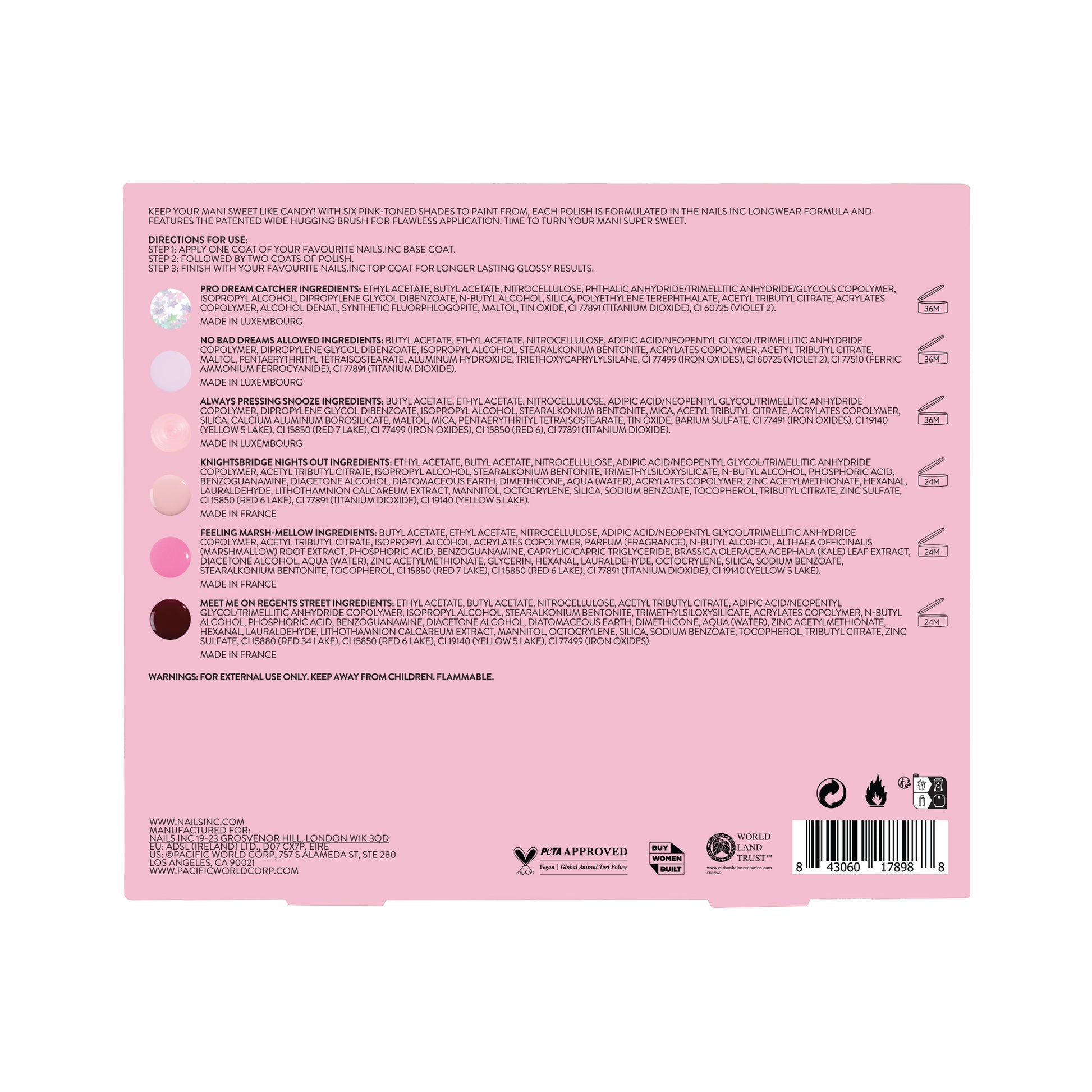 FEELING MARSH-MELLOW: BUTYL ACETATE, ETHYL ACETATE, NITROCELLULOSE, ADIPIC ACID/NEOPENTYL GLYCOL/TRIMELLITIC ANHYDRIDE COPOLYMER, ACETYL TRIBUTYL CITRATE, ISOPROPYL ALCOHOL, ACRYLATES COPOLYMER, PARFUM (FRAGRANCE), N-BUTYL ALCOHOL, ALTHAEA OFFICINALIS (MARSHMALLOW) ROOT EXTRACT, PHOSPHORIC ACID, BENZOGUANAMINE, CAPRYLIC/CAPRIC TRIGLYCERIDE, BRASSICA OLERACEA ACEPHALA (KALE) LEAF EXTRACT, DIACETONE ALCOHOL, AQUA (WATER), ZINC ACETYLMETHIONATE, GLYCERIN, HEXANAL, LAURALDEHYDE, OCTOCRYLENE, SILICA, SODIUM BENZOATE, STEARALKONIUM BENTONITE, TOCOPHEROL, CI 15850 (RED 7 LAKE), CI 15850 (RED 6 LAKE), CI 77891 (TITANIUM DIOXIDE), CI 19140 (YELLOW 5 LAKE).